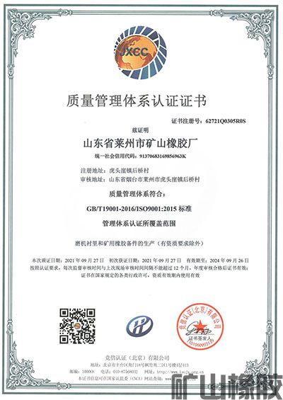 山東省萊州市礦山橡膠廠2003年率先通過(guò)ISO9001:2000質(zhì)量管理體系認(rèn)證;2018年再次通過(guò)山東魯源節(jié)能認(rèn)證技術(shù)工程有限公司第三方辦理的GB/T19001-2016 / ISO9001:2015質(zhì)量管理體系認(rèn)證。